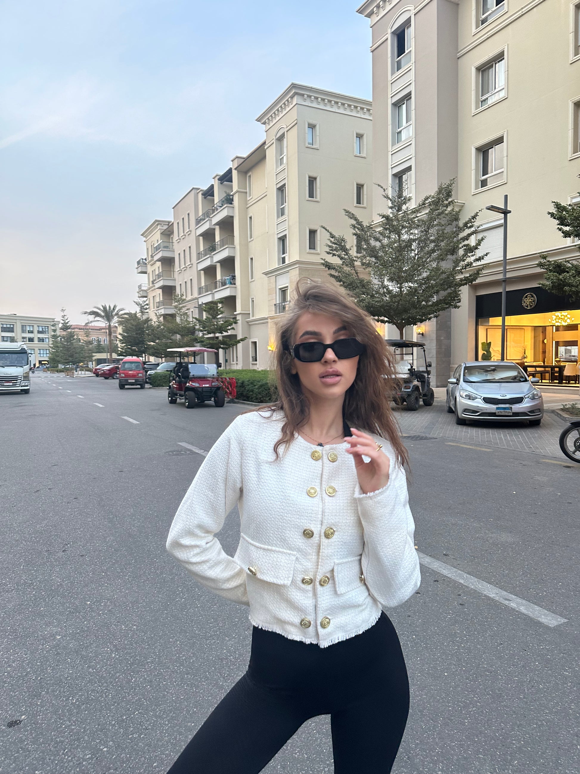 A white tweed jacket with elegant buttons, perfect for any occasion. From daytime chic to nighttime polish, it gives every girl that refined, old-money look.
